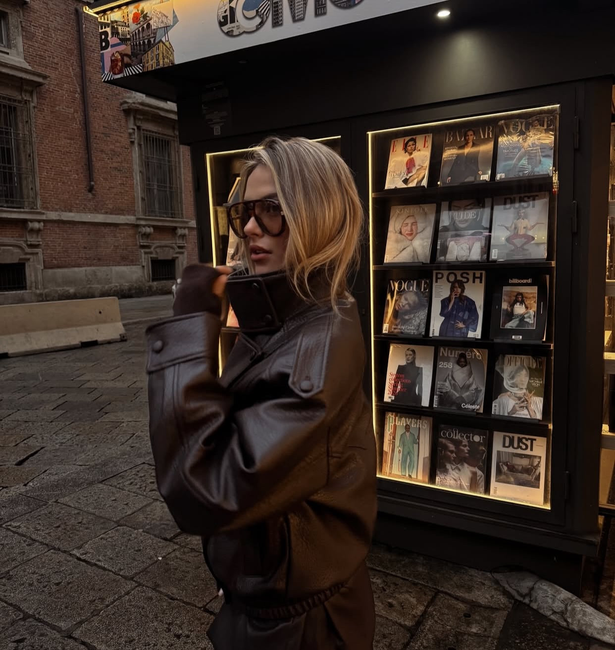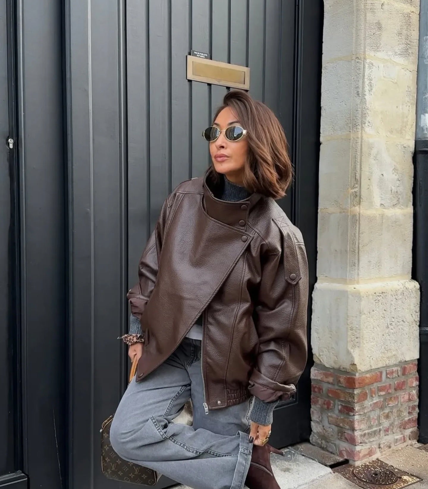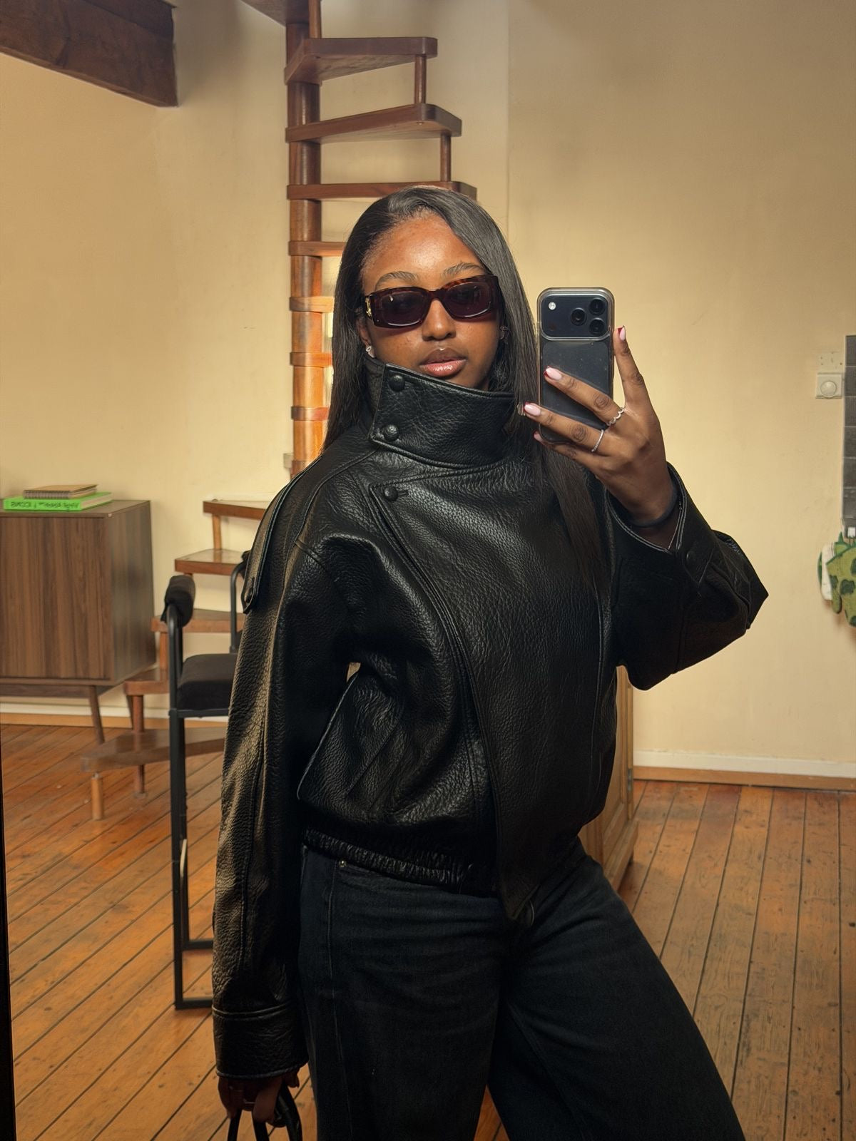 A cropped faux-leather layer with a softly oversized silhouette, dropped shoulders, and a high stand collar that gives you instant structure without the stiffness.